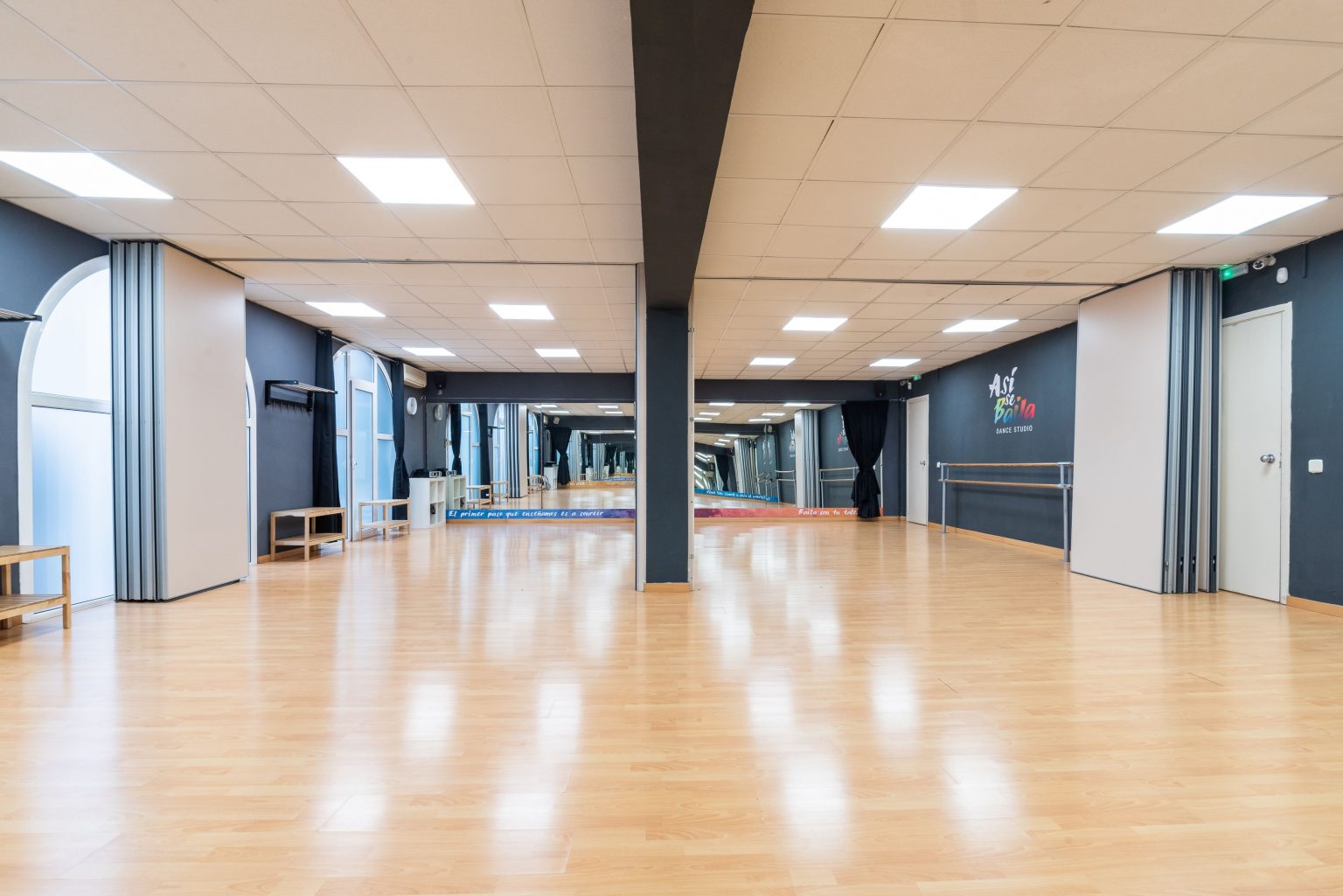 30m2 de espacio diáfano. Parqué, espejos, tabla de mezclas con conexión cable RCA o bluetooth y aire acondicionado.